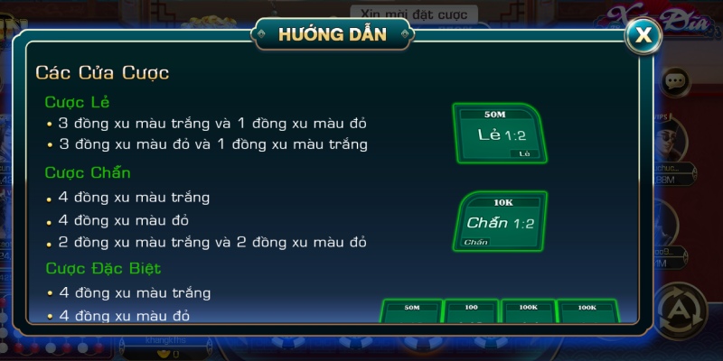 - Cược chẵn: Kết quả hiển thị 4 đỏ/4 trắng hoặc 2 đỏ 2 trắng với mức thanh toán 1:2.